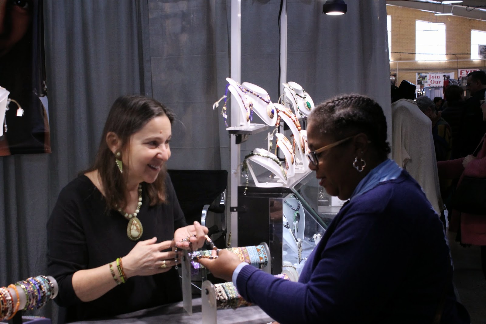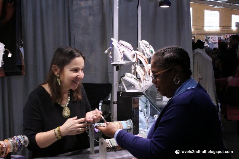 What drew us was a quality, juried craft fair. The was run by a company called ARTRIDER. They run fairs whose vendors are much more ART than Craft. For example we met Robin McLaughlin, who owns Stonecrop Beadworks (web site). She was very friendly and makes the most beautiful bead and stone jewelry.